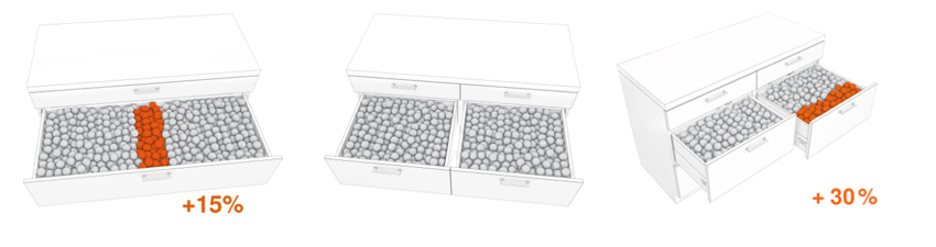 Los módulos extraíbles altos con laterales cerrados aprovechan toda la altura. De este modo resulta más fácil apilar los artículos y se obtiene hasta un 55% más de espacio.